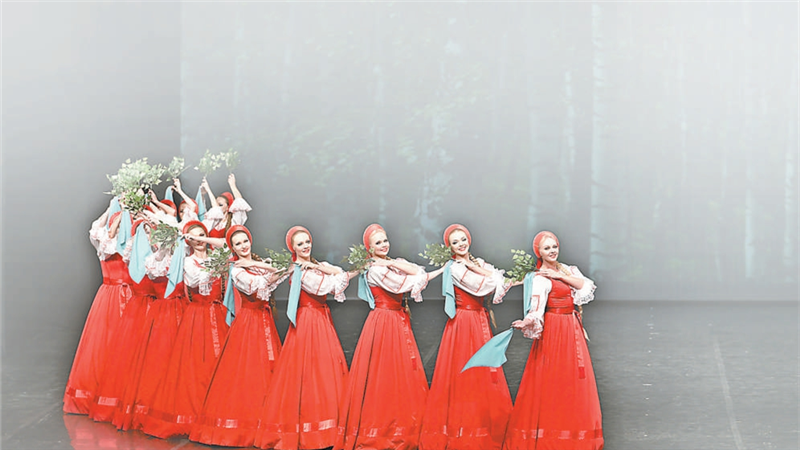 ??這一次,“小白樺”帶著經(jīng)典劇目歸來,回顧并展望兩國的深厚情誼。《白樺獻禮》演出共包含15支作品:女子環(huán)舞《小白樺》中,“云步”驚艷,靈動明麗;女子舞蹈《秋日》中,少女們的頭巾被染成金黃、橙紅,時而驟然揚起,時而平穩(wěn)飄動,舞臺上似有落葉漫天飛舞;男子舞蹈《馬車夫之歌》中,短暫休憩的“車夫”以精妙復(fù)雜的舞步相互切磋,繼而帶著熱血奔向廣袤大地;《西伯利亞組舞》是充滿趣味的三幕舞蹈作品,“獵熊”一段尤為精彩,看似威嚴(yán)可怖的“熊”藏著一個可親活潑的靈魂,最終,它在熱烈的舞蹈中成為西伯利亞人民團結(jié)與力量的象征……
