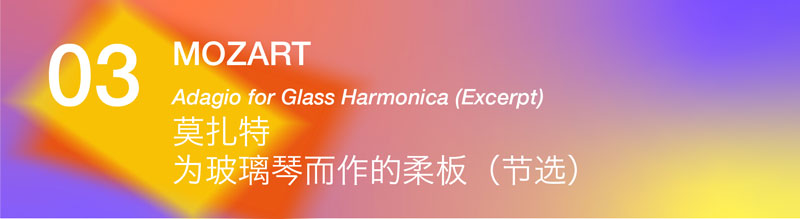 ??玻璃琴是美國著名的科學(xué)家、發(fā)明家、社會(huì)活動(dòng)家富蘭克林發(fā)明的一種樂器。富蘭克林將發(fā)聲的單體由高腳杯改為底端有套接孔的碗狀玻璃,由大到小依序串接后橫臥于琴架,演奏者以沾濕的手指碰觸玻璃碗的邊緣來演奏。小提琴大師帕格尼尼更贊嘆道:“這是天堂的聲音!”莫扎特初聞玻璃琴,立即為之著迷,為這件樂器作有數(shù)首作品,這首柔板充分展示了玻璃琴輕盈縹緲的音色,也包含了莫扎特最優(yōu)秀的旋律創(chuàng)意。