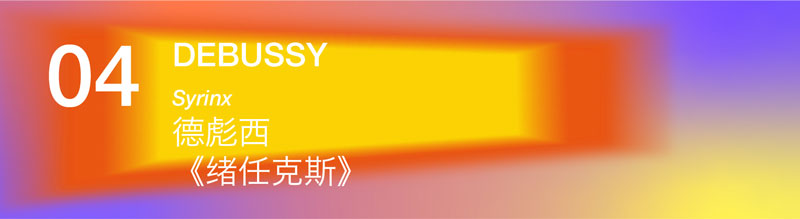 ??德彪西(Achille-Claude Debussy,1862-1918),法國作曲家,他的音樂被冠以“印象主義”的標(biāo)簽。這段音樂的文學(xué)意象是取材自古希臘神話:牧神潘愛上了山林之神緒任克斯,為了躲避牧神潘,緒任克斯化作一叢蘆葦,潘神遍尋不著,便折下蘆葦做成樂器,吹奏起音樂……樂曲開始,旋律寧謐而略帶憂傷,德彪西充分發(fā)掘了長笛的特點(diǎn),通過不同的吹奏技巧展現(xiàn)出長笛的明媚、柔美及錦緞般的音色,并在樂曲中自由運(yùn)用半音階、五聲音階和全音階,帶來與眾不同的、晦明晦暗的色彩。