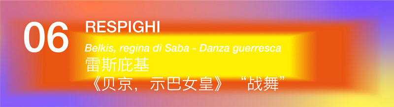 ??雷斯庇基(Ottorino Respighi , 1879-1936)是世紀(jì)之交意大利器樂創(chuàng)作領(lǐng)域最具天賦的作曲家,他的管弦樂創(chuàng)作色彩斑斕、美妙動(dòng)聽,具有非同一般的感染力。這部芭蕾舞劇再現(xiàn)了公元前1000年示巴女王貝京的一系列的奇妙旅程。“戰(zhàn)舞”描繪出狂喜的慶?;顒?dòng),矯健的年輕戰(zhàn)士們在鼓上跳躍、舞蹈,足踵錘擊出雷鳴般的節(jié)奏,充滿異國情調(diào)的管樂間或其中,戰(zhàn)士們充滿陽剛之氣,“發(fā)出戰(zhàn)爭吶喊,同時(shí)揮舞著長矛,跳著他們奇妙的舞蹈”。