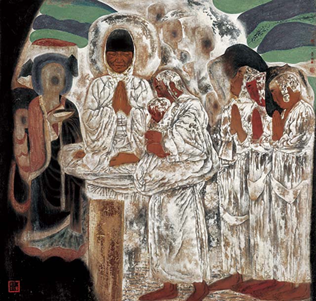 唐勇力 《敦煌之夢——母親的祈禱》 絹本設(shè)色 138cm×136cm 1996年