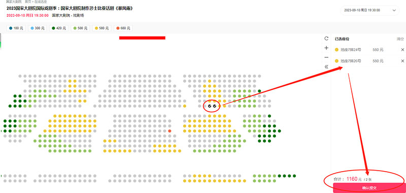 ??3、選擇相應(yīng)演出日期和票檔。按票檔顏色進(jìn)行選座,確認(rèn)后點(diǎn)擊“提交”按鈕。
