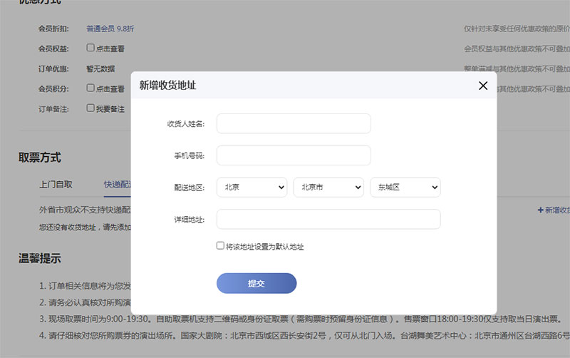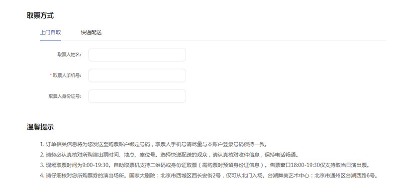 ??5、確定好演出信息及票價(jià)后,選擇取票方式,上門自取和快遞配送(目前僅支持北京全境快遞,外省市暫不提供演出票快遞配送服務(wù))。
