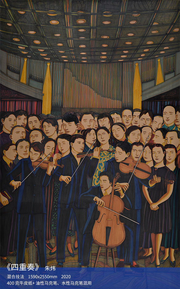 無(wú)論這幅畫里的貝多芬及眾多先賢大師,還是那幾位似乎在用生命忘我舞蹈的舞者、靜靜環(huán)繞四重奏音樂(lè)家那些無(wú)名無(wú)姓的觀眾,以及那上百幅簡(jiǎn)潔卻充滿深意的演奏者速寫,都將藝術(shù)生活中某個(gè)本或許會(huì)轉(zhuǎn)瞬即逝的時(shí)刻定格。從那定格的瞬間里,我們仿佛看到:音樂(lè)響起時(shí),大幕拉開時(shí),哪里還有什么作者、聽(tīng)眾和表演者的區(qū)分,樂(lè)里樂(lè)外,不分時(shí)空,所有邊界早已溶化,一切都已融為一體,流淌在其中的只有所有人默默的共情,以及因此而生的彼此間的相互懂得、胸懷里的海闊天空!或許,在描述藝術(shù)生活帶給人世的美妙感悟方面,這樣的語(yǔ)句并不新鮮,但能將它定格成令人信服和感動(dòng)的畫面的,卻并不多見(jiàn)。其實(shí),這也正是我們發(fā)起這個(gè)為期多年的特邀藝術(shù)家計(jì)劃的初衷之一:通過(guò)這些畫作,朱煒先生把藝術(shù)生活和劇場(chǎng)世界中那些最感人的時(shí)刻,定格成了永恒的視覺(jué)記憶和回味!在感謝之余,我們將繼續(xù)期待朱煒先生未來(lái)創(chuàng)作出更多佳作,用視覺(jué)藝術(shù)帶我們?nèi)ヌ剿魉囆g(shù)生活和劇場(chǎng)世界中那深遠(yuǎn)宏大的天地。
