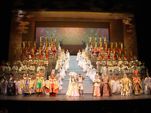 此次,國(guó)家大劇院版《圖蘭朵》赴韓演出,不僅是中韓文化交流的一大盛事,更是“國(guó)家大劇院出品”的劇目首次走出國(guó)門的一大盛事。此次巡演為降低成本,中韓雙方按照國(guó)際慣例建立起合作機(jī)制。大劇院方面派出一支非常職業(yè)化的龐大陣容,從主演陣容、管弦樂(lè)團(tuán)、合唱團(tuán)到舞臺(tái)技術(shù)人員等總計(jì)200余名中方演出人員開(kāi)赴韓國(guó)演出,同時(shí)韓方也派出了舞蹈隊(duì)、童聲合唱及部分工作人員,使總體參演人數(shù)達(dá)到了300余人,這在以往中韓文化交流中都是很少達(dá)到的規(guī)模。